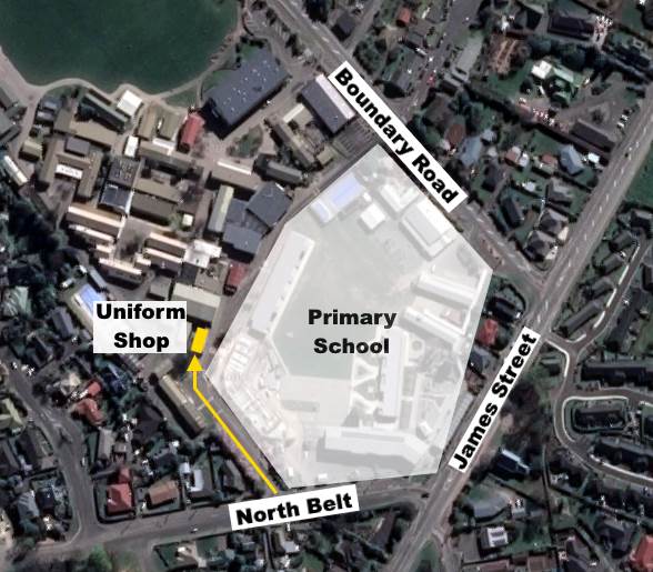 The uniform shop is next to the school hall. Easiest access is from the North Belt gate